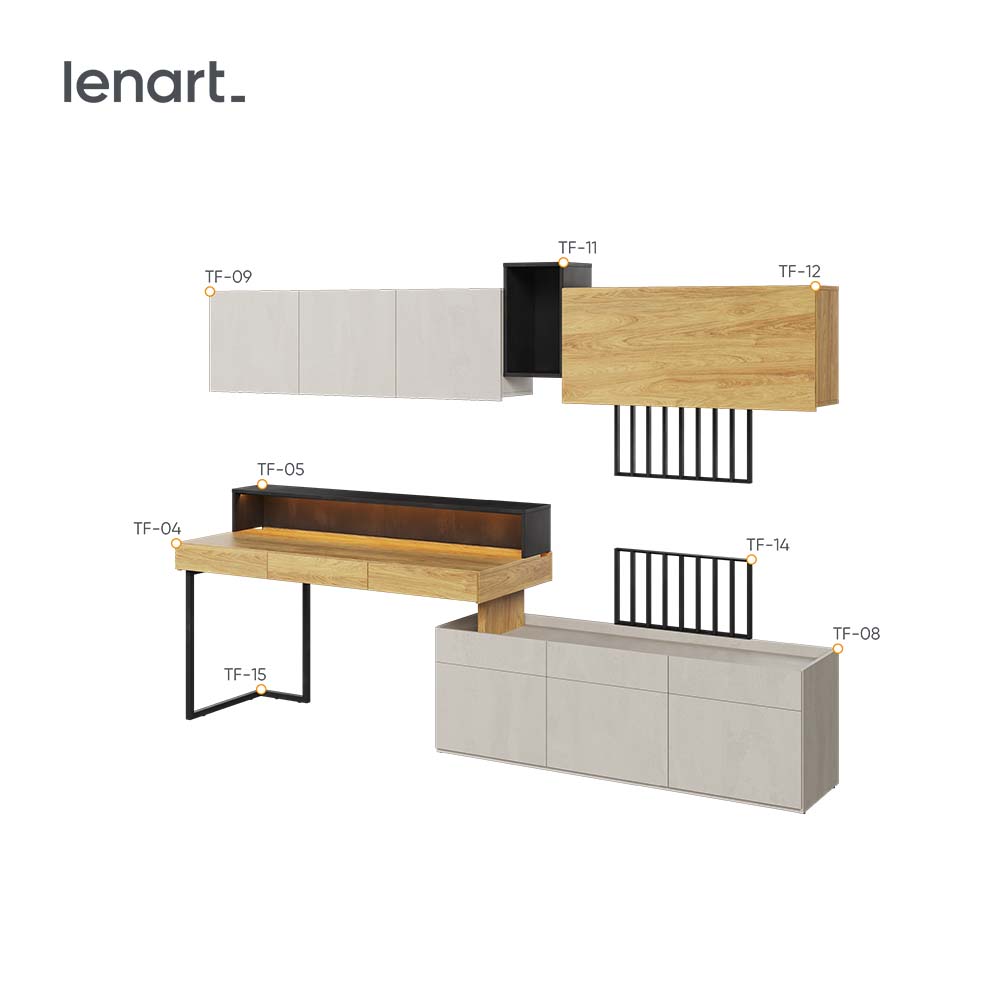 TF04 Schreibtisch 150 mit 3 Schubladen rechts/links (150/76/61) TF05 Schreibtischaufsatz 150 mit orangefarbener Beleuchtung (150/19/22) TF08 3-türiger Schrank (150/52/42) TF09 Hängeschrank 3-türig (150/45/27) TF11 Wandregal 27 (27/24/21) TF12 Hängeschrank 1-türig (102/45/27) TF14 TV-Panel mit orangefarbener Beleuchtung (57/30/3) |