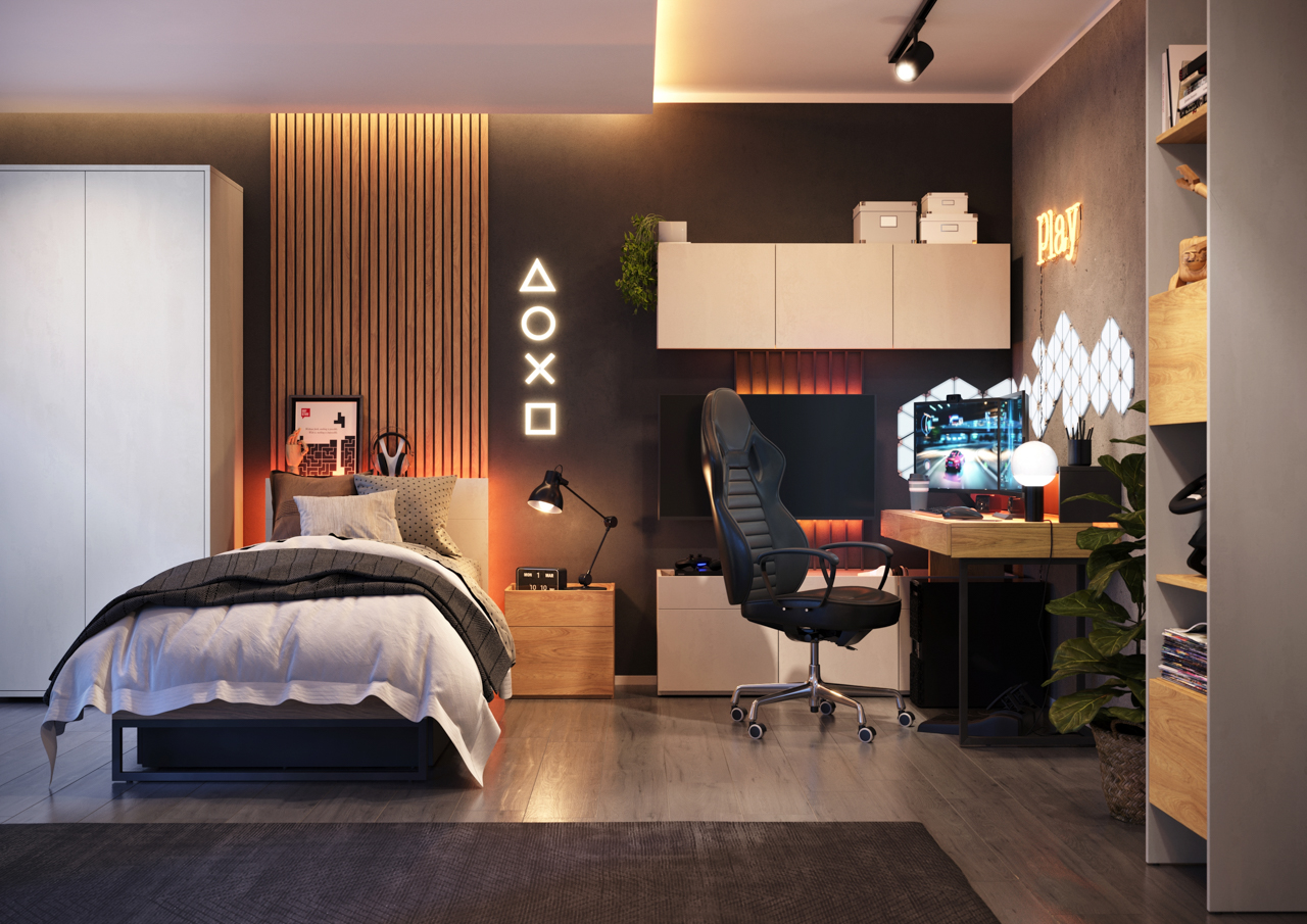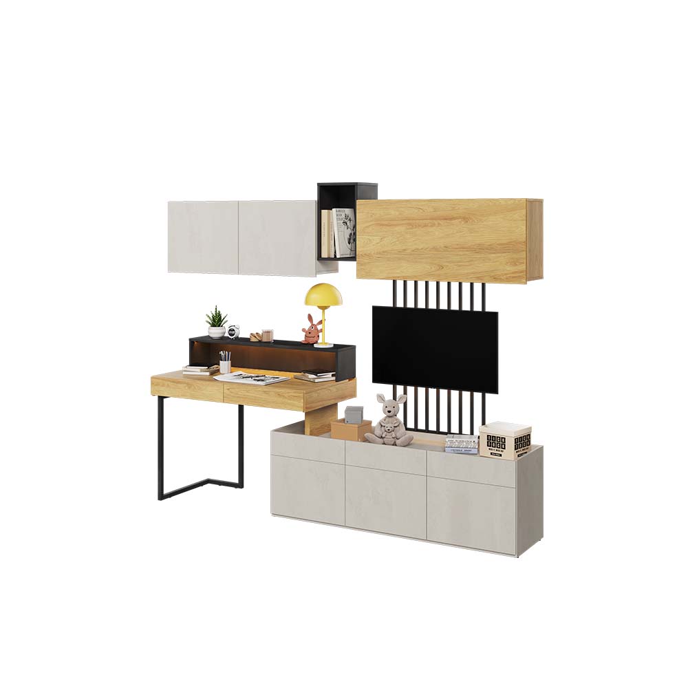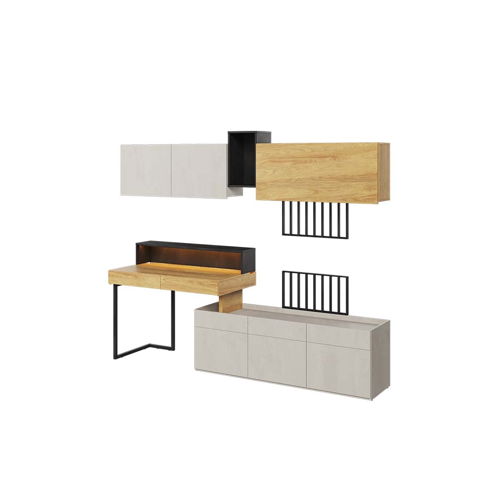 TF06 Schreibtisch 110 mit 2 Schubladen rechts/links (110/76/61) TF07 Schreibtischaufsatz 110 mit orangefarbener Beleuchtung (110/19/22) TF08 3-türiger Schrank (150/52/42) TF10 Hängeschrank 2-türig (110/45/27) TF11 Wandregal 27 (27/24/21) TF12 Hängeschrank 1-türig (102/45/27) TF14 TV-Panel mit orangefarbener Beleuchtung (57/30/3) |