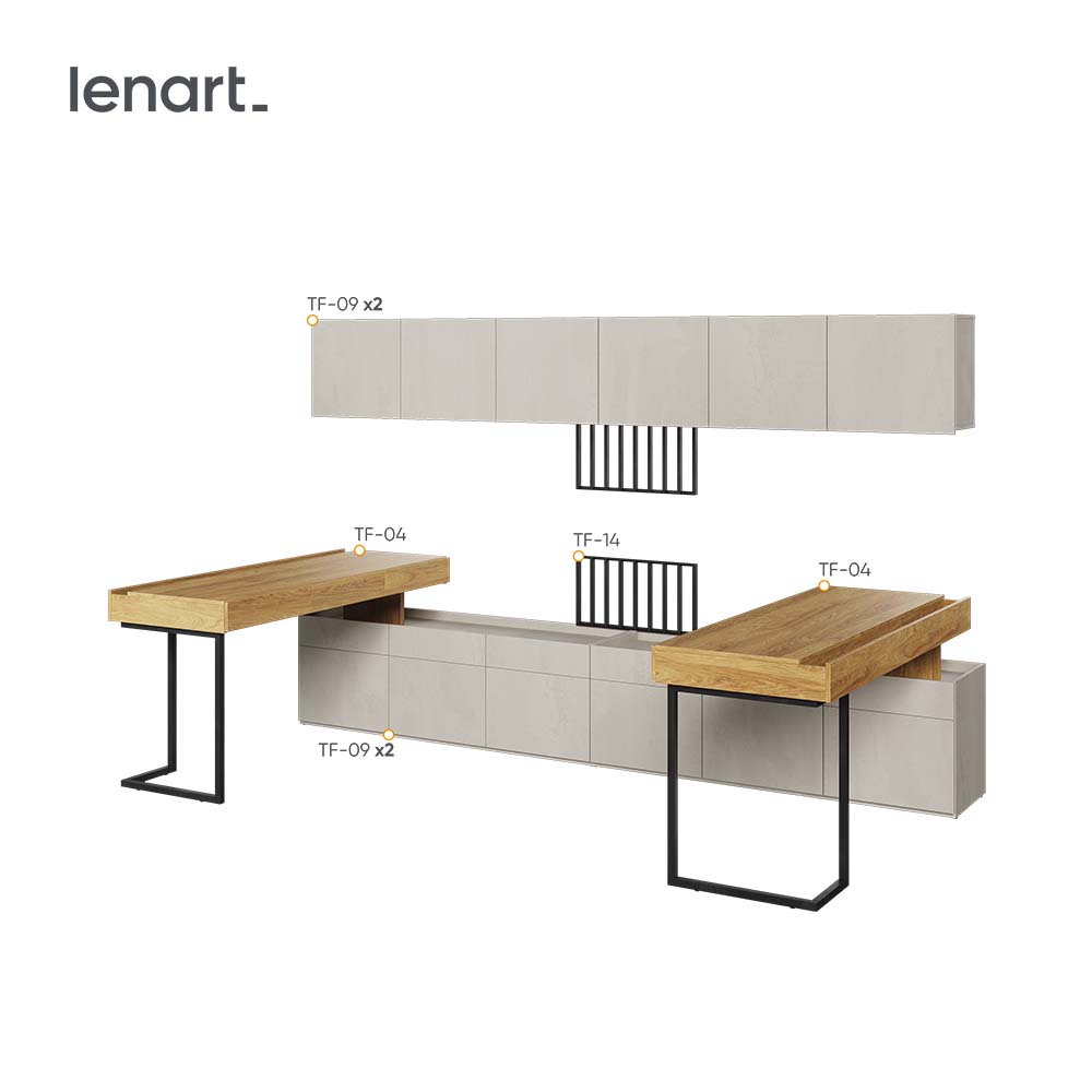 2x TF04 Schreibtisch 150 mit 3 Schubladen rechts/links (150/76/61) 2x TF08 3-türiger Schrank (150/52/42) 2x TF09 Hängeschrank 3-türig (150/45/27) TF14 TV-Panel mit orangefarbener Beleuchtung (57/30/3) |