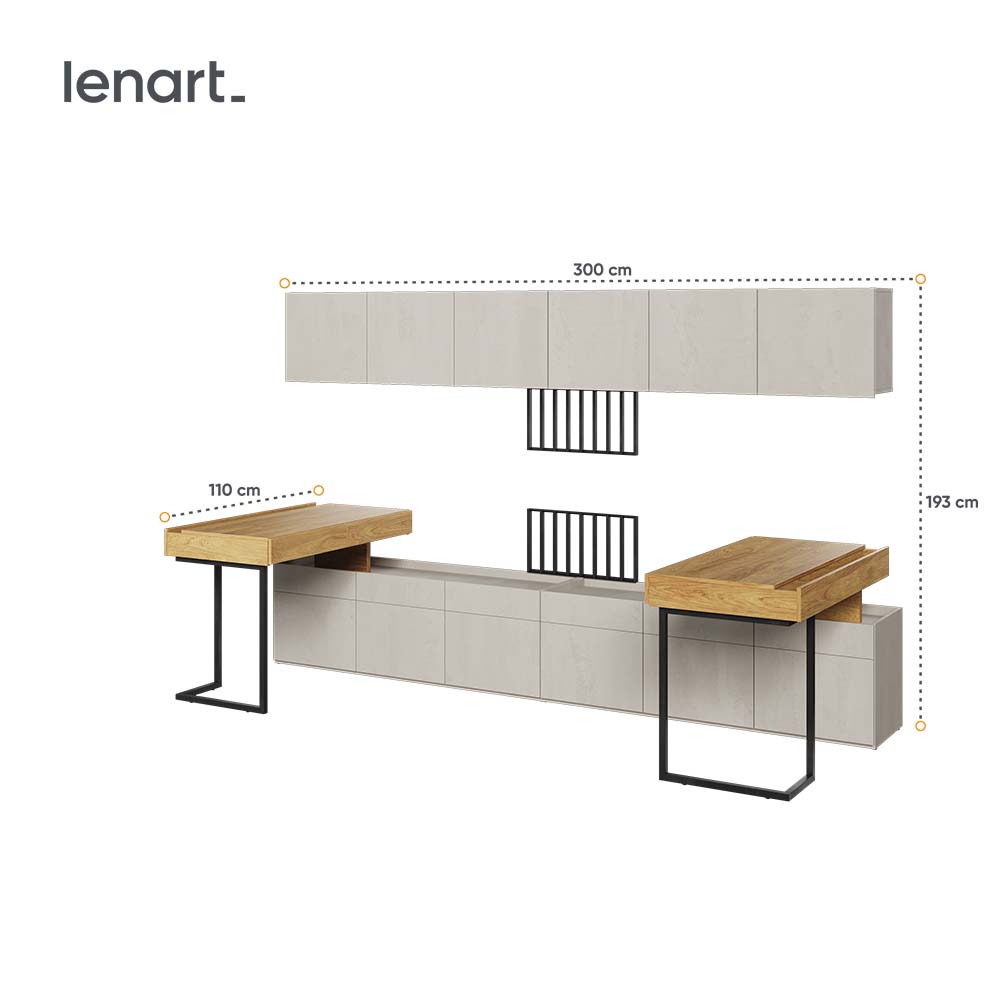 2x TF06 Schreibtisch 110 mit 2 Schubladen rechts/links (110/76/61) 2x TF08 3-türiger Schrank (150/52/42) 2x TF09 Hängeschrank 3-türig (150/45/27) TF14 TV-Panel mit orangefarbener Beleuchtung (57/30/3) |