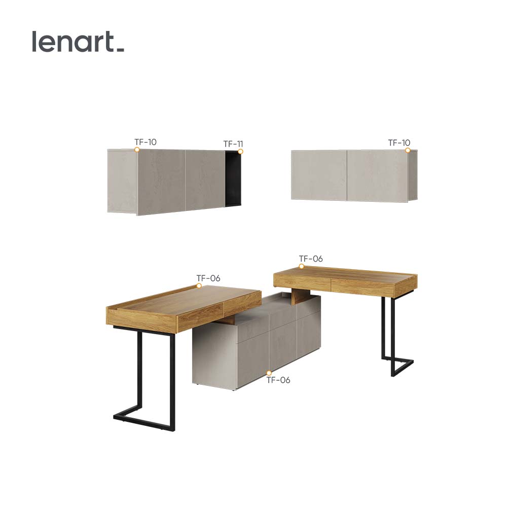 2x TF06 Schreibtisch 110 mit 2 Schubladen rechts/links (110/76/61) TF08 3-türiger Schrank (150/52/42) 2x TF10 Hängeschrank 2-türig (110/45/27) TF11 Wandregal 27 (57/30/3) |