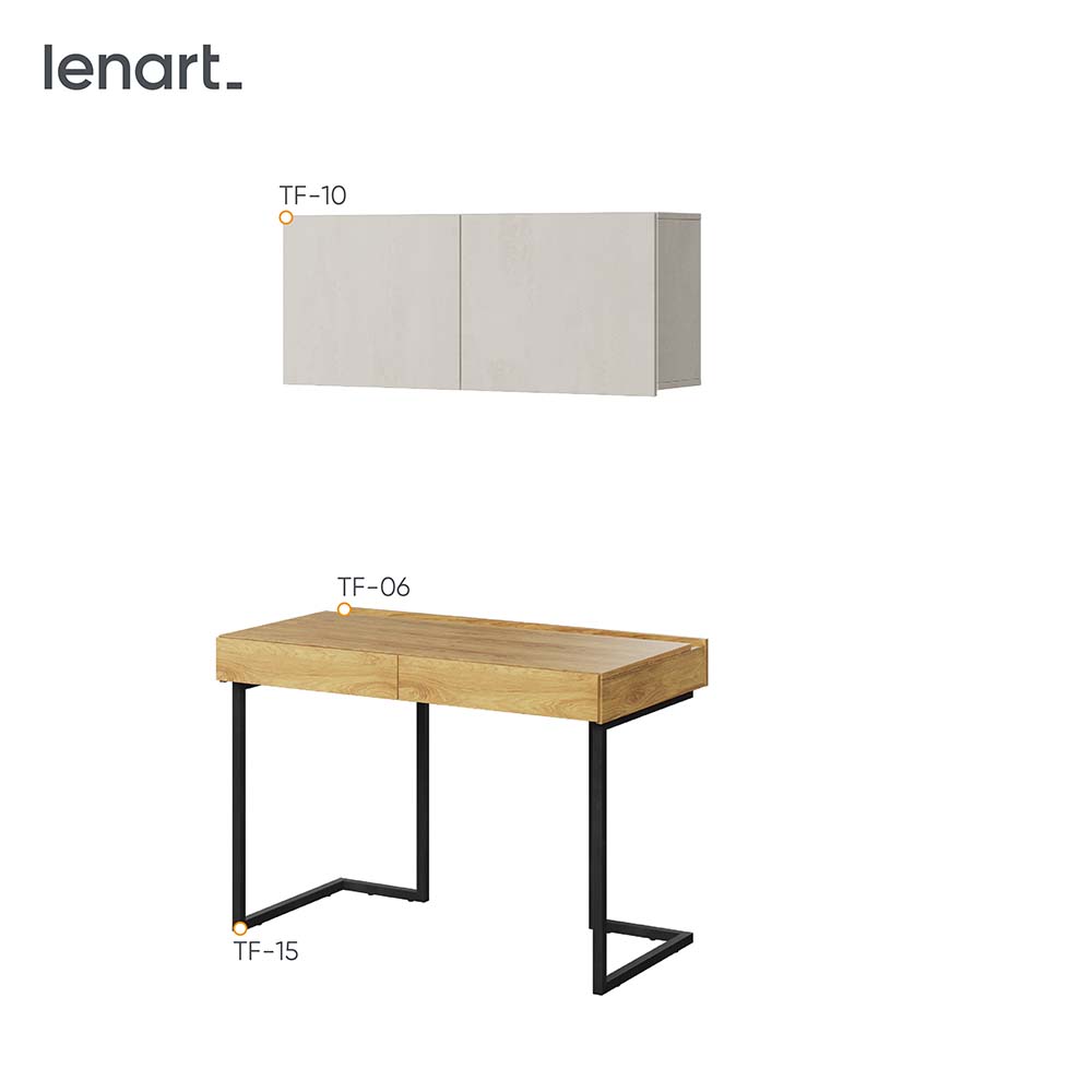 TF06 Schreibtisch 110 mit 2 Schubladen rechts/links (110/76/61) TF10 Hängeschrank 2-türig (110/45/27) TF15 Schreibtischbein (29/62/50) |