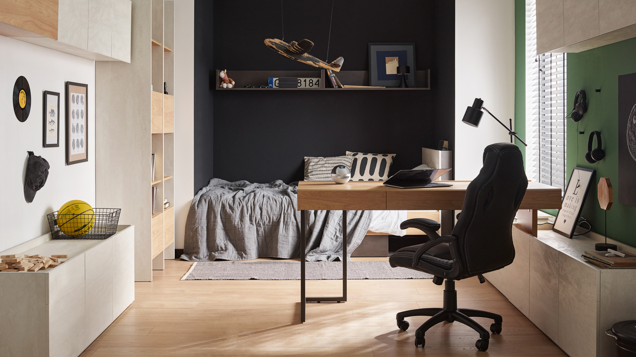 TF06 Schreibtisch 110 mit 2 Schubladen rechts/links (110/76/61) TF07 Schreibtischaufsatz 110 mit orangefarbener Beleuchtung (110/19/22) TF08 3-türiger Schrank (150/52/42)