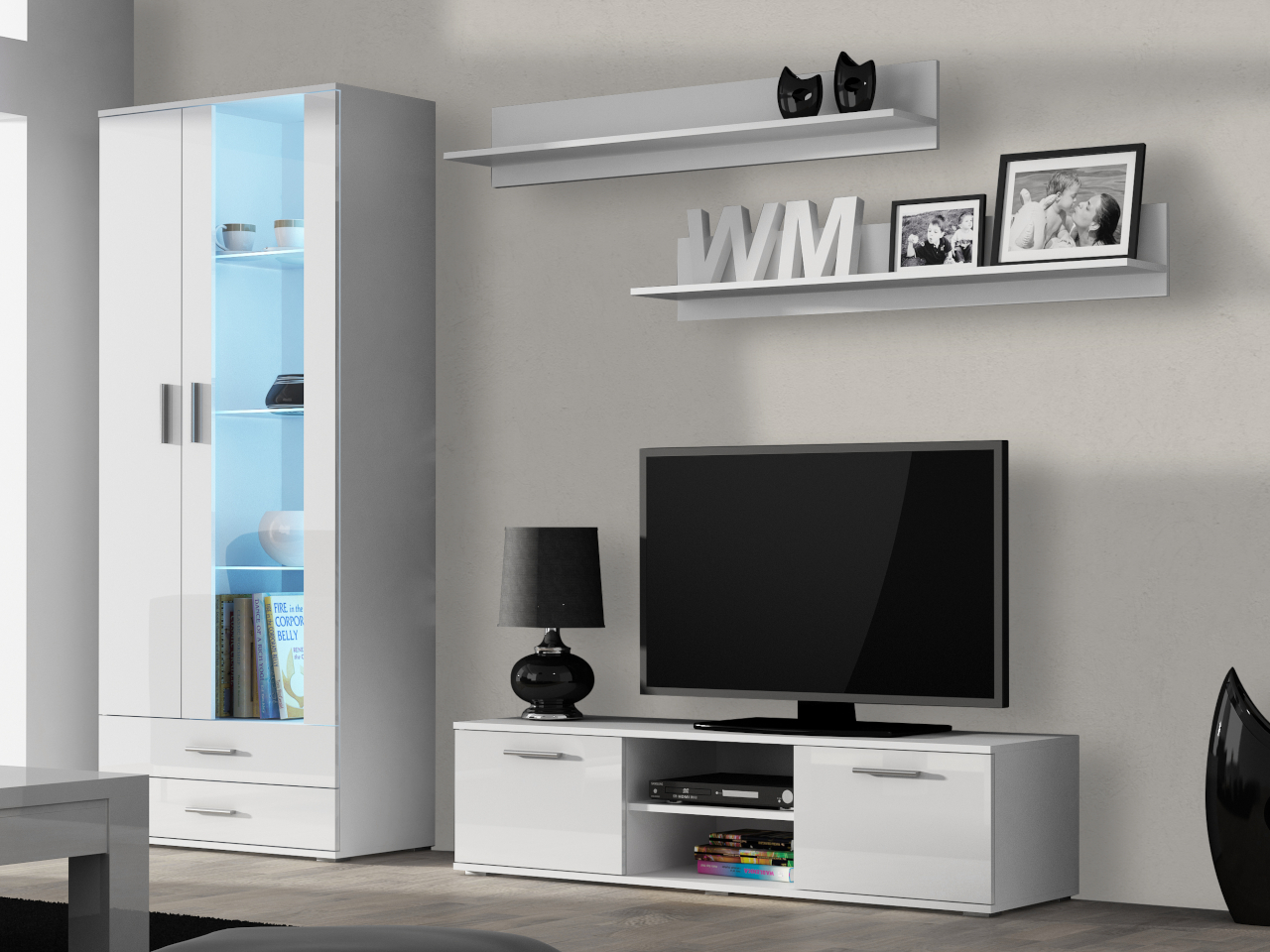 Hohe Vitrine SINDI SH7 (80/192/41) TV Lowboard 140 SINDI SH4 (140/37/43) Wandregal SINDI SH5 (125/20/20)- 2 Stücke |
