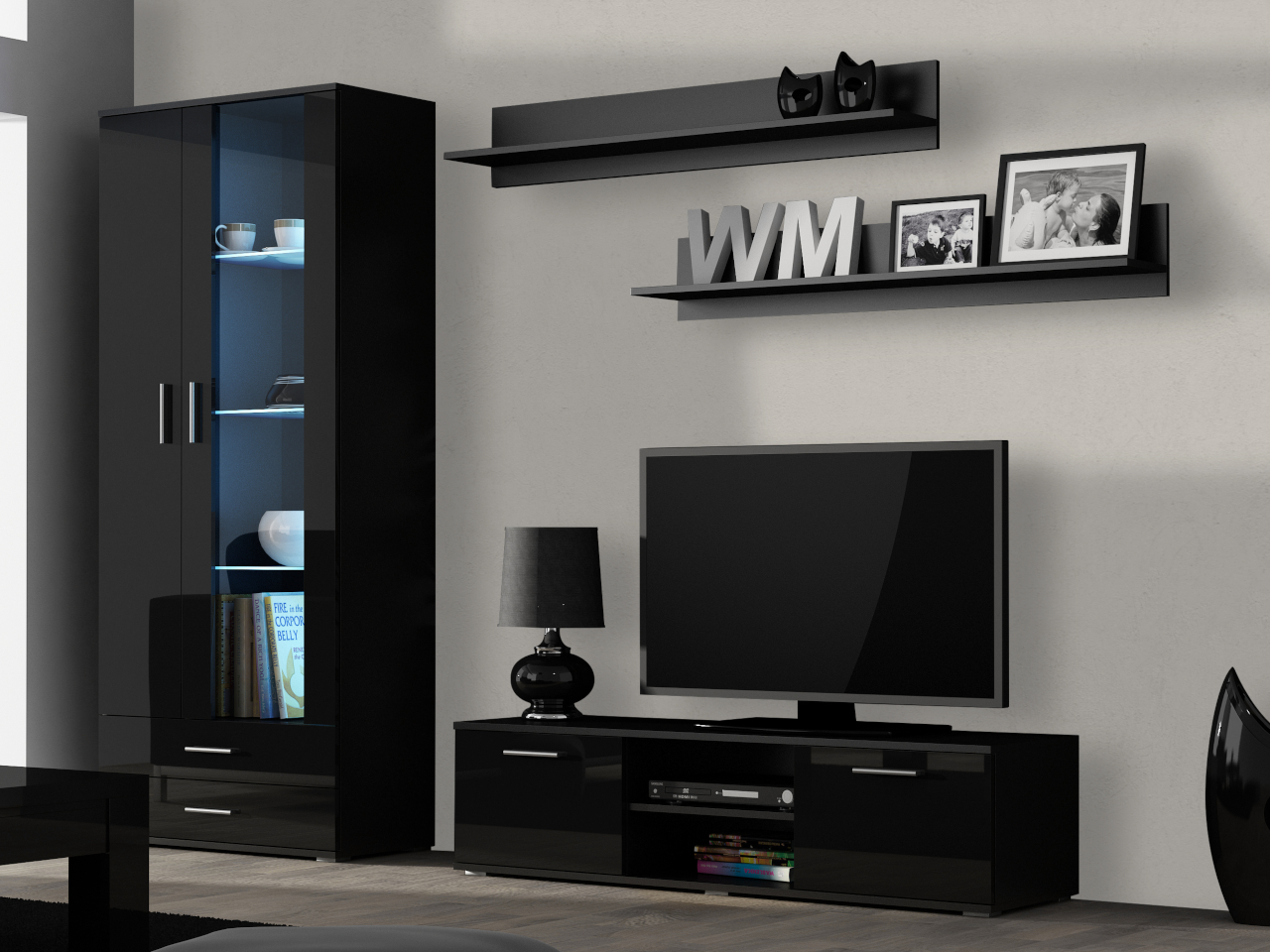 Hohe Vitrine SINDI SH7 (80/192/41) TV Lowboard 140 SINDI SH4 (140/37/43) Wandregal SINDI SH5 (125/20/20)- 2 Stücke |